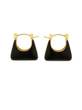 Product Details: A pair of geometric hoop earrings featuring a unique triangular design in glossy black enamel framed with a rich gold-tone finish. Bold yet minimal, these earrings are perfect for making a chic statement.