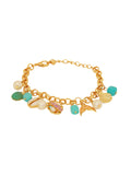 A vibrant and playful charm bracelet that brings the beach to your wrist β adorned with ocean-inspired motifs, pearls, and pops of turquoise, all set in a radiant gold-tone chain.