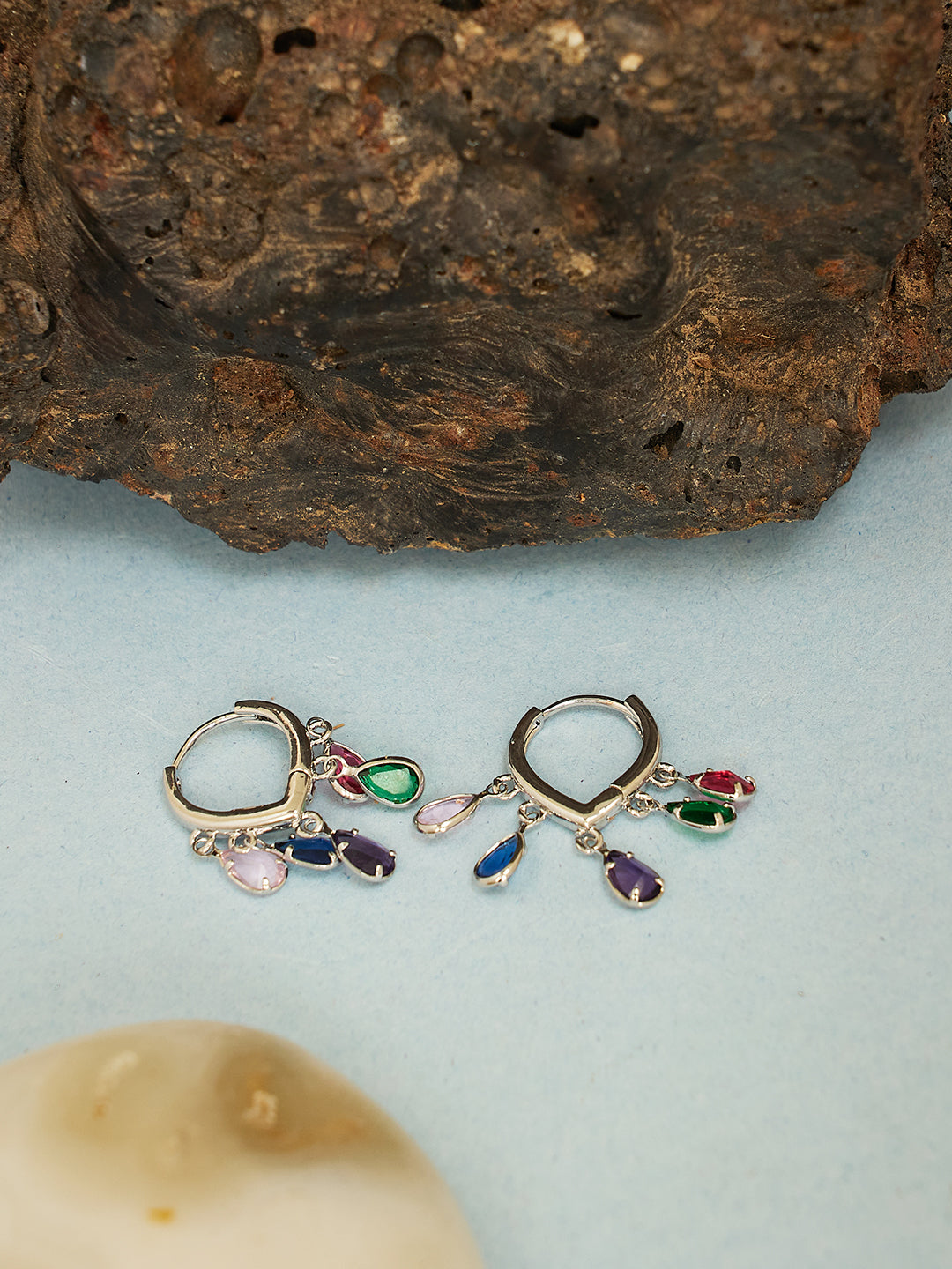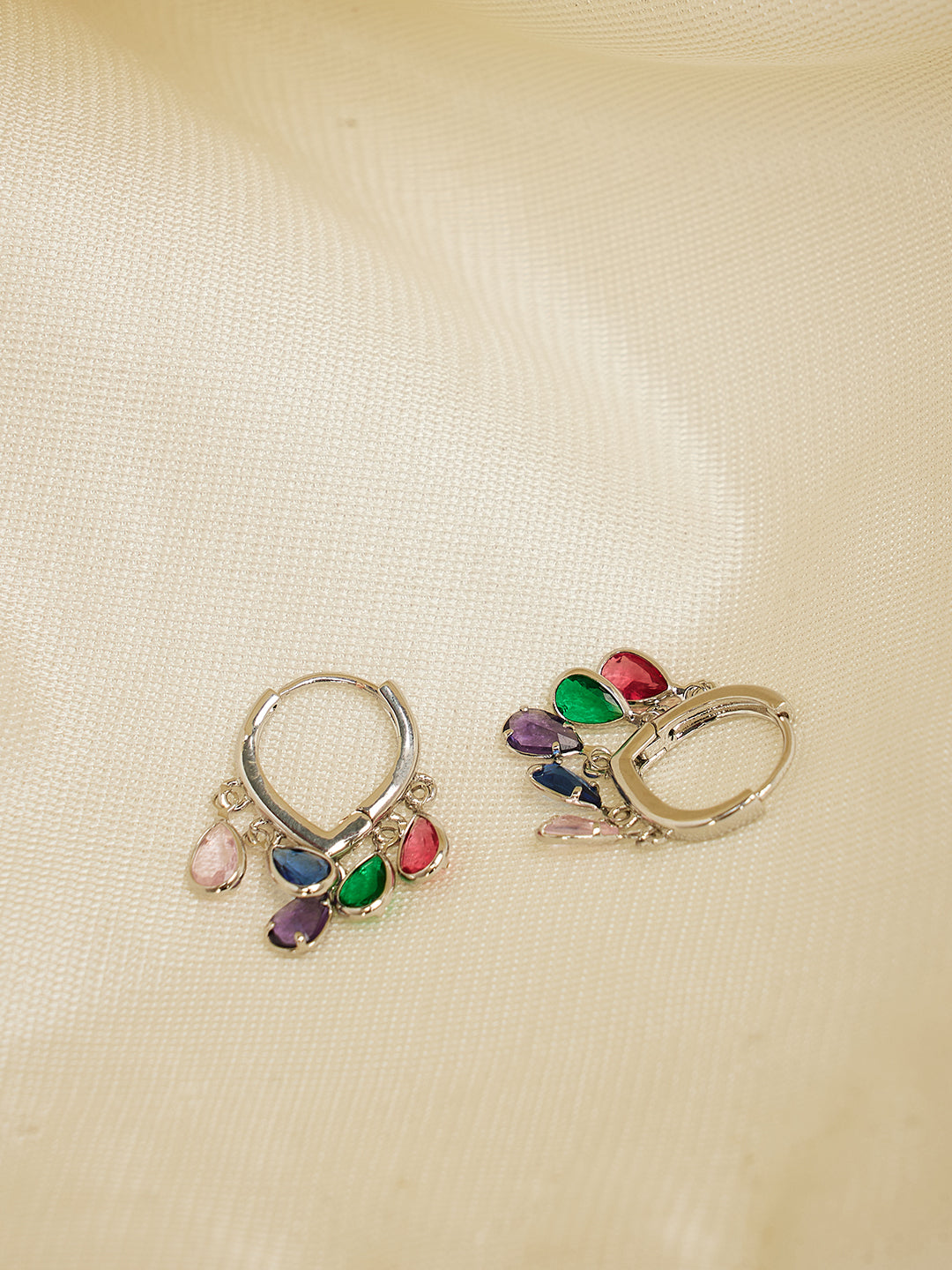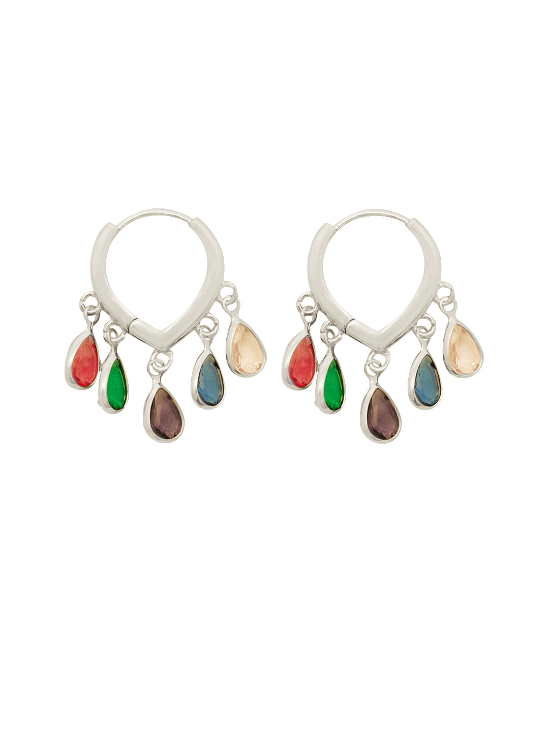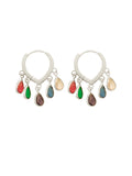 Silver-plated hoop earrings adorned with multicolor teardrop charms. Lightweight, vibrant, and perfect for festive or casual chic looks.