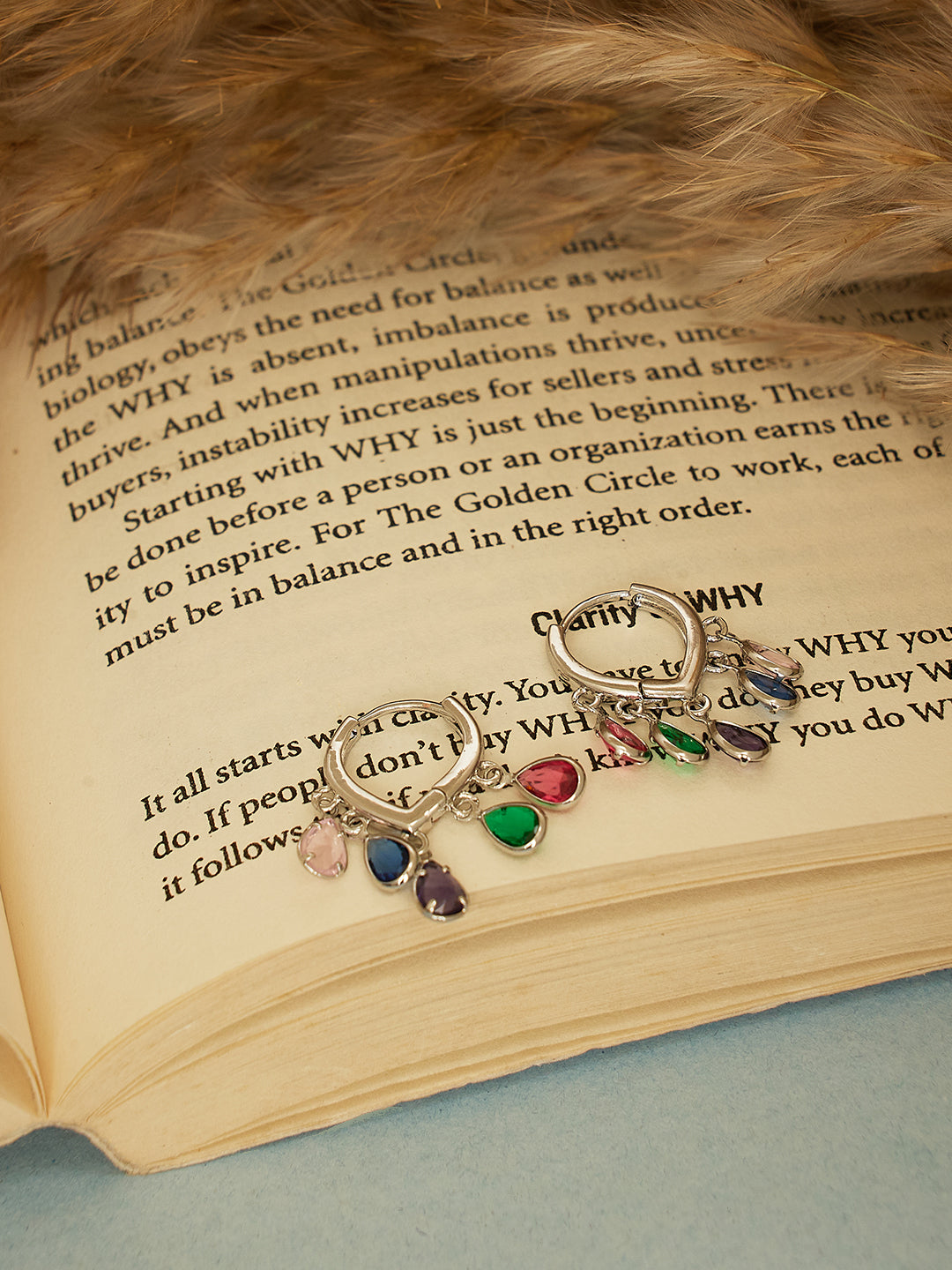 Product Details: Hoop-style earrings with dangling teardrop charms in multiple colors (red, green, blue, peach, and purple) for a vibrant look.