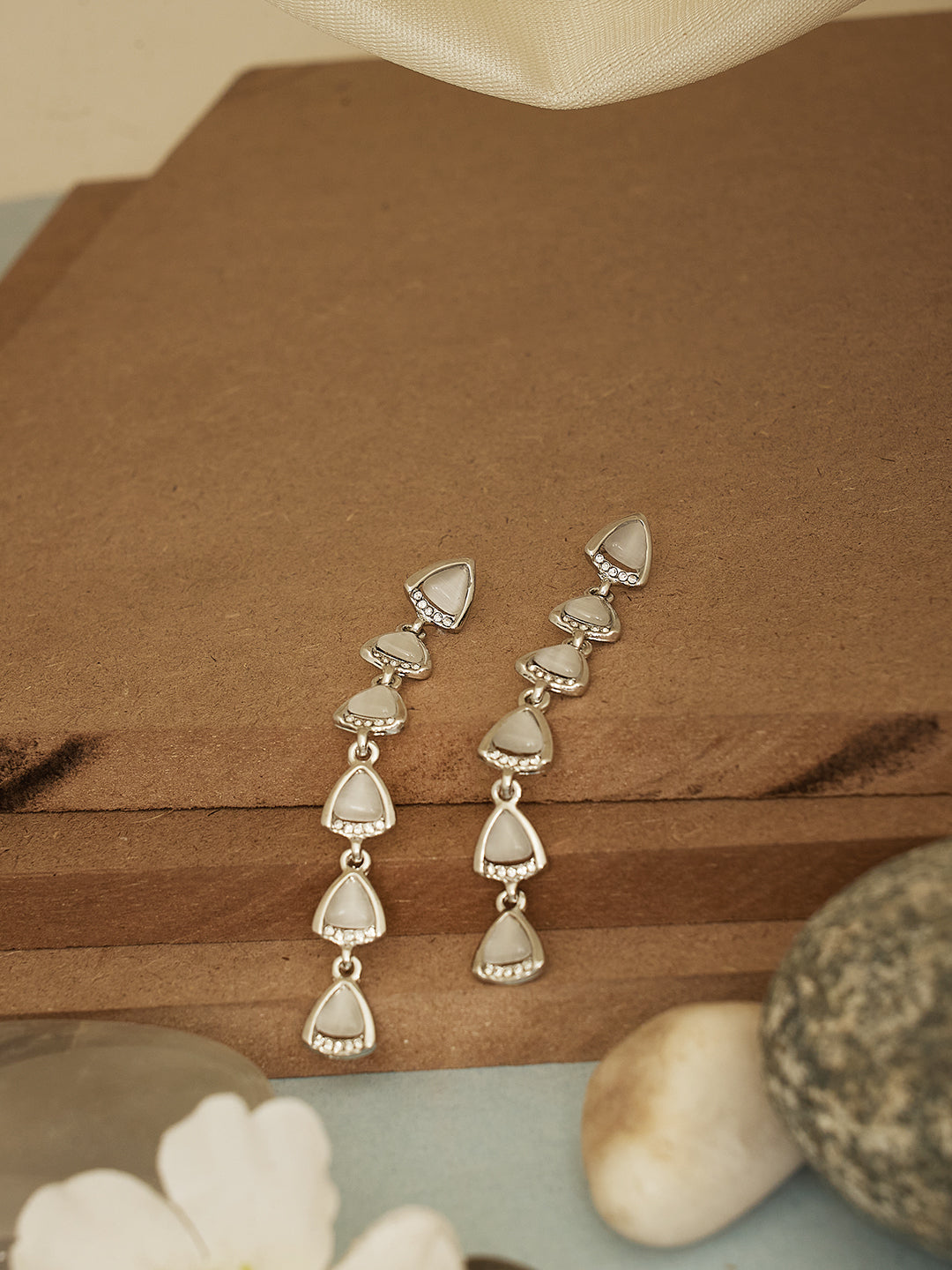 Product Details: Sophisticated long drop earrings featuring cascading triangular enamel charms with subtle rhinestone detailing. Lightweight yet statement-making, perfect for adding elegance to any outfit.