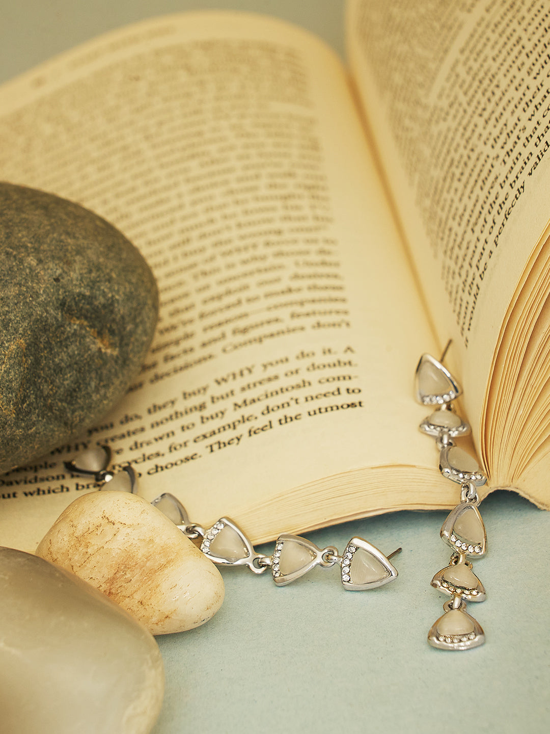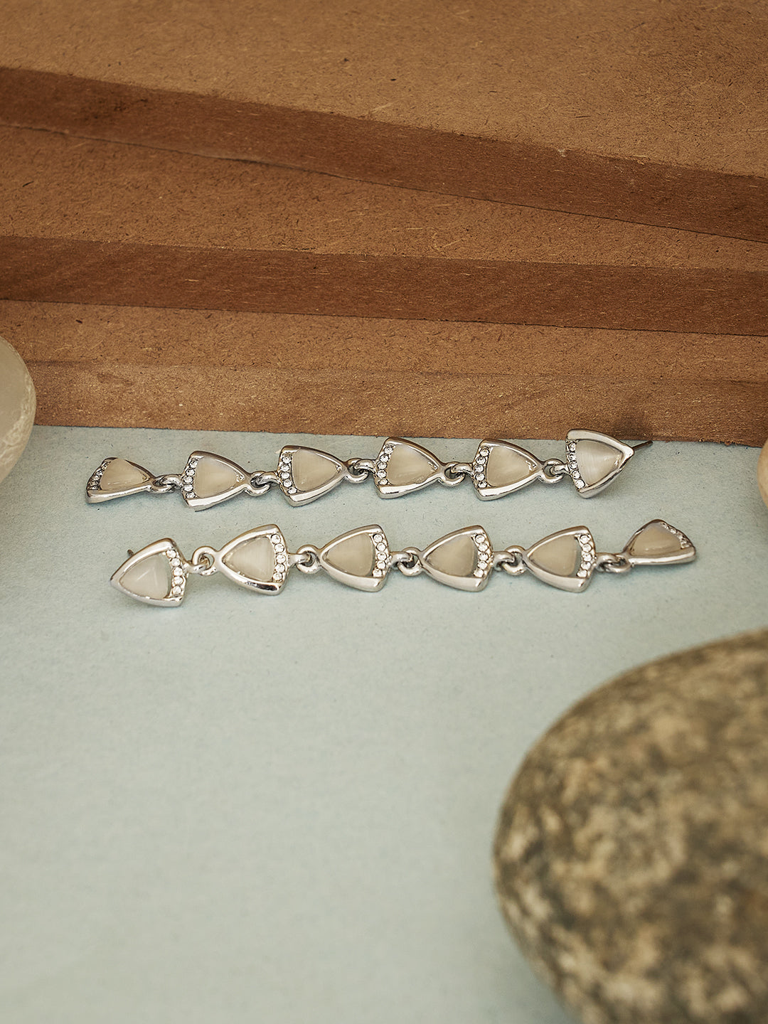Elegant silver-tone drop earrings with cascading enamel triangles and rhinestone accents β perfect for festive and evening wear.