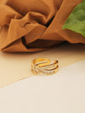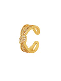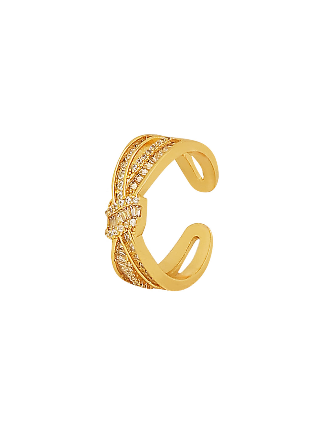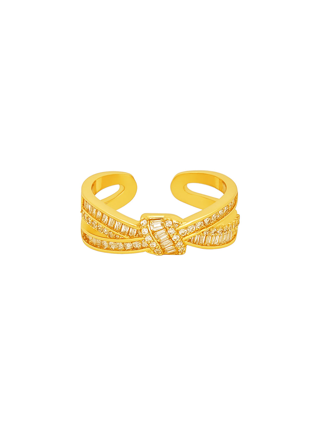 A dazzling gold-toned adjustable ring designed with intricate cubic zirconia detailing and a knotted centerpiece, perfect for special occasions.