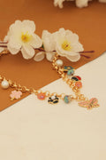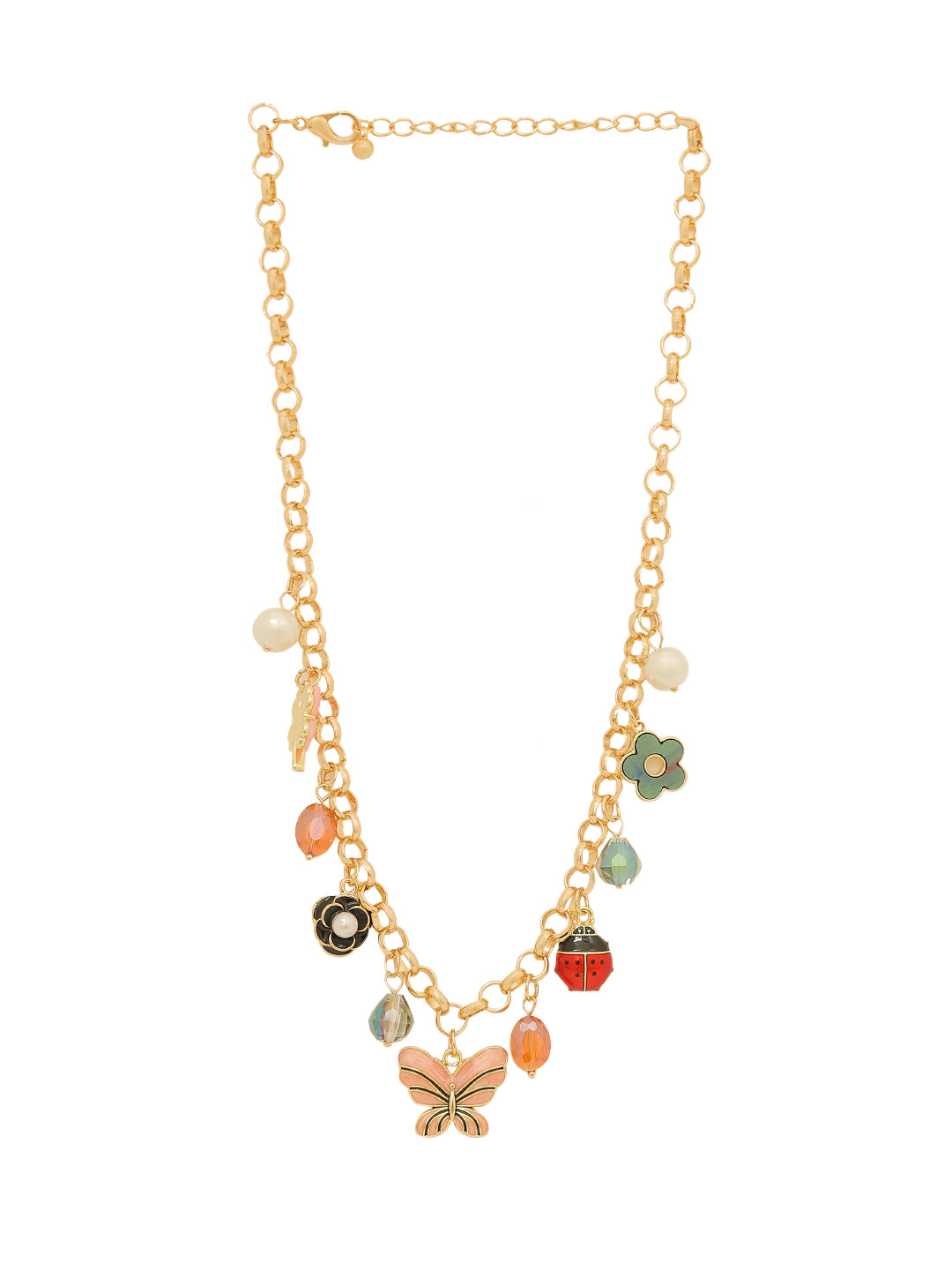 A whimsical gold-plated charm necklace adorned with playful pendants—featuring a butterfly, flowers, pearls, crystals, and a ladybug for a joyful, feminine touch.