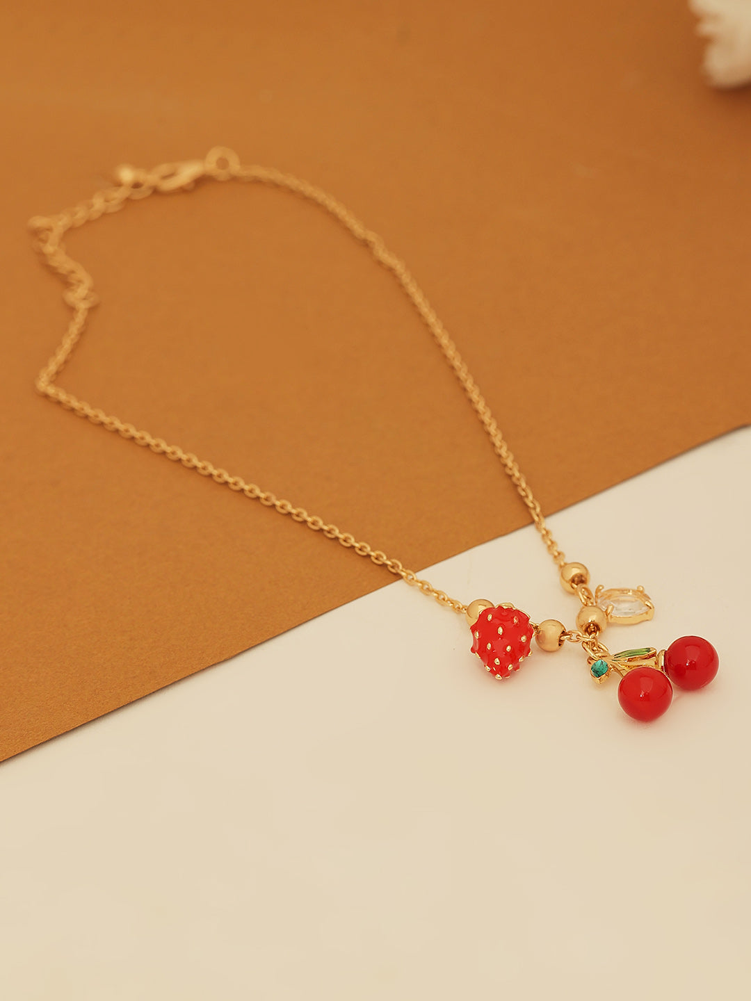 A playful gold-plated charm necklace featuring vibrant cherry and strawberry pendants for a fresh, fruity, and youthful vibe.