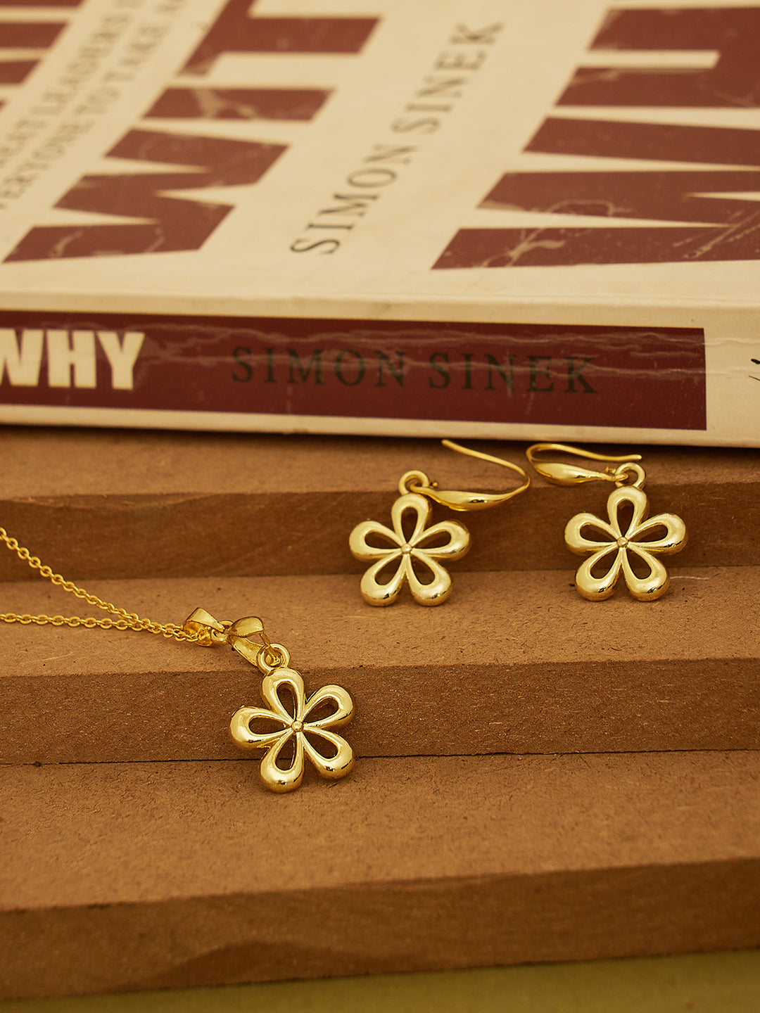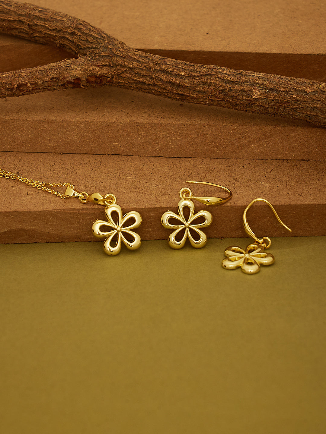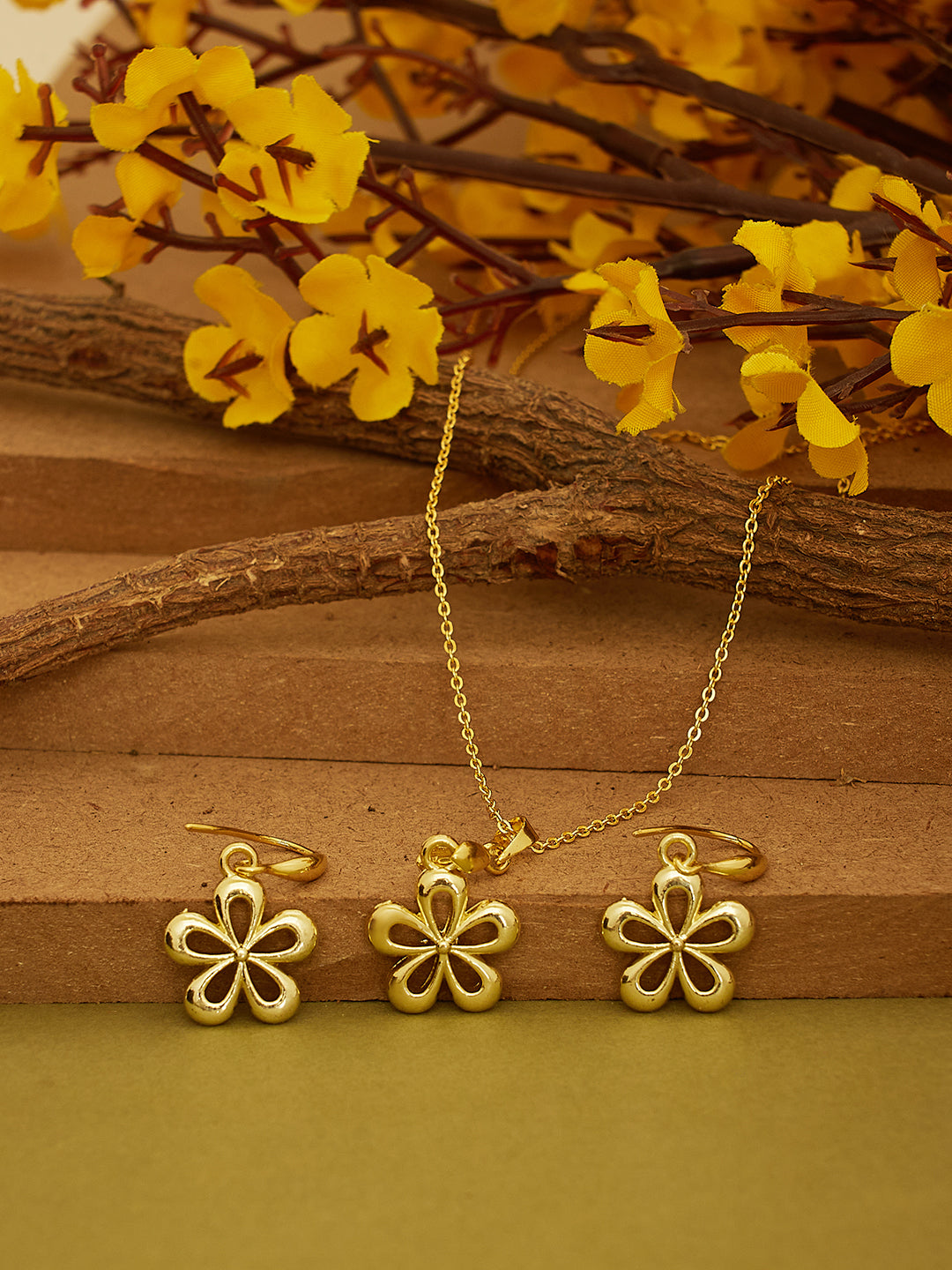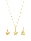 A charming gold-toned necklace set featuring a delicate floral pendant with matching earrings. Lightweight, elegant, and perfect for everyday or festive wear.