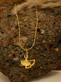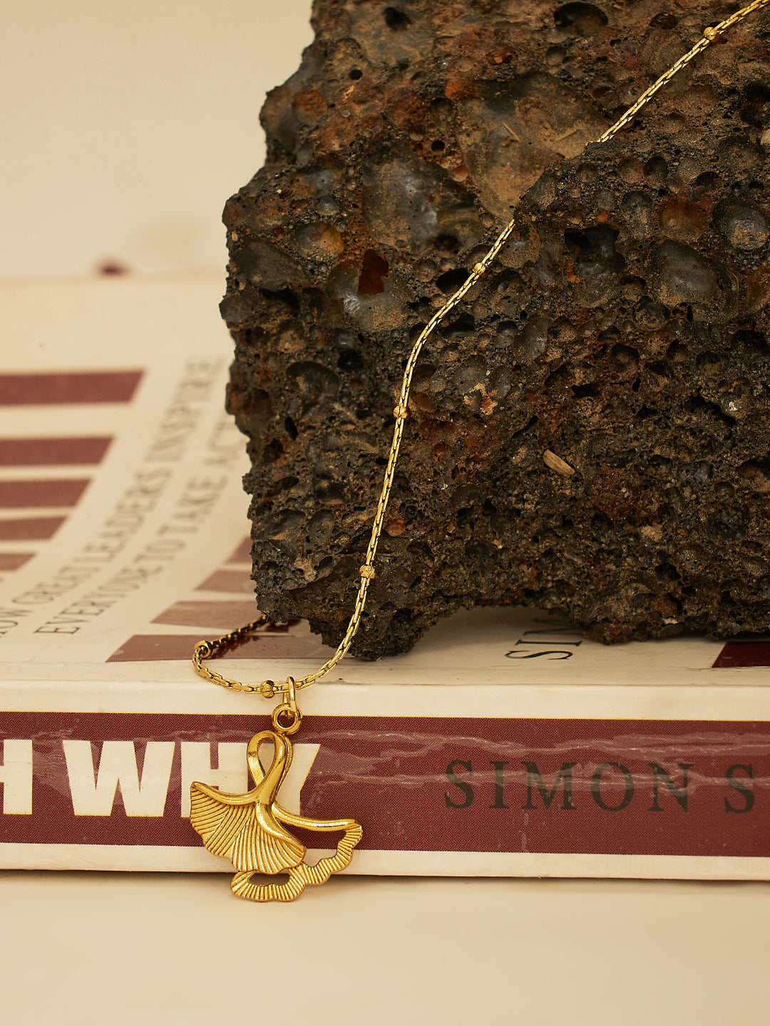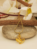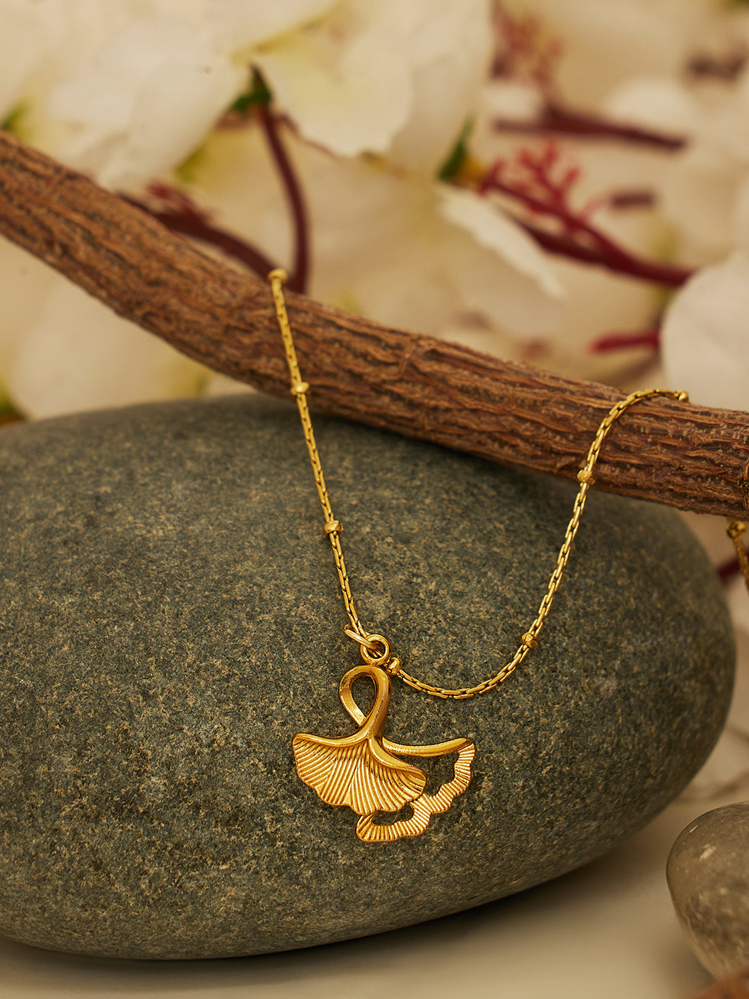 This necklace features a fine gold-plated chain with delicate bead accents along its length. The highlight is the intricate floral-style pendant with a modern artistic cut-out design, making it versatile for both daily wear and festive occasions.