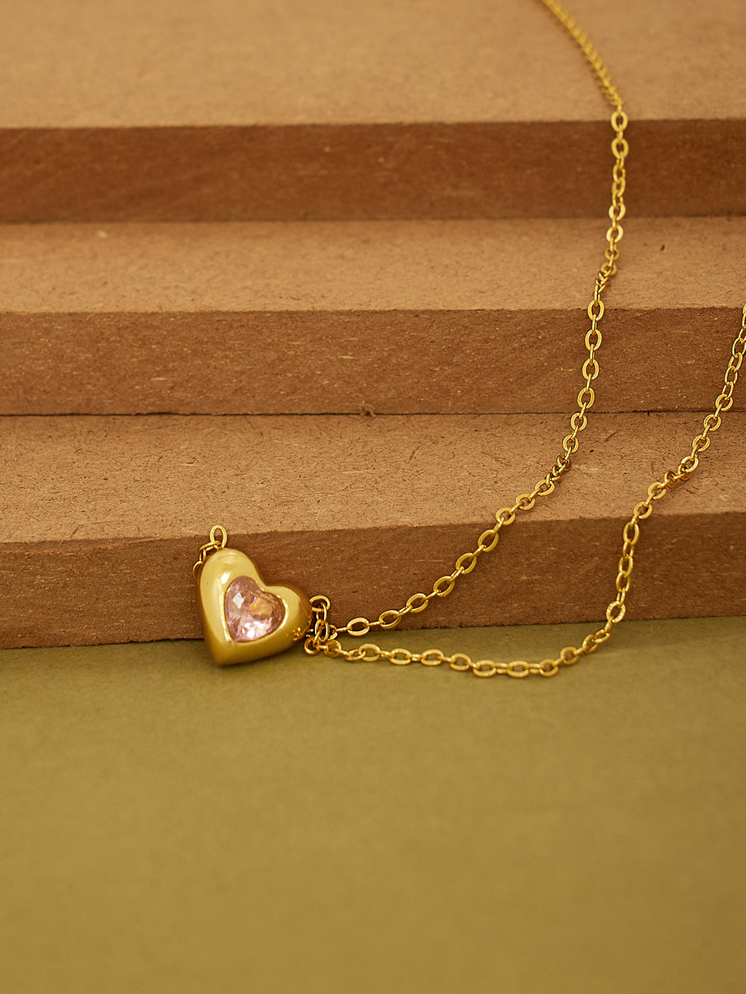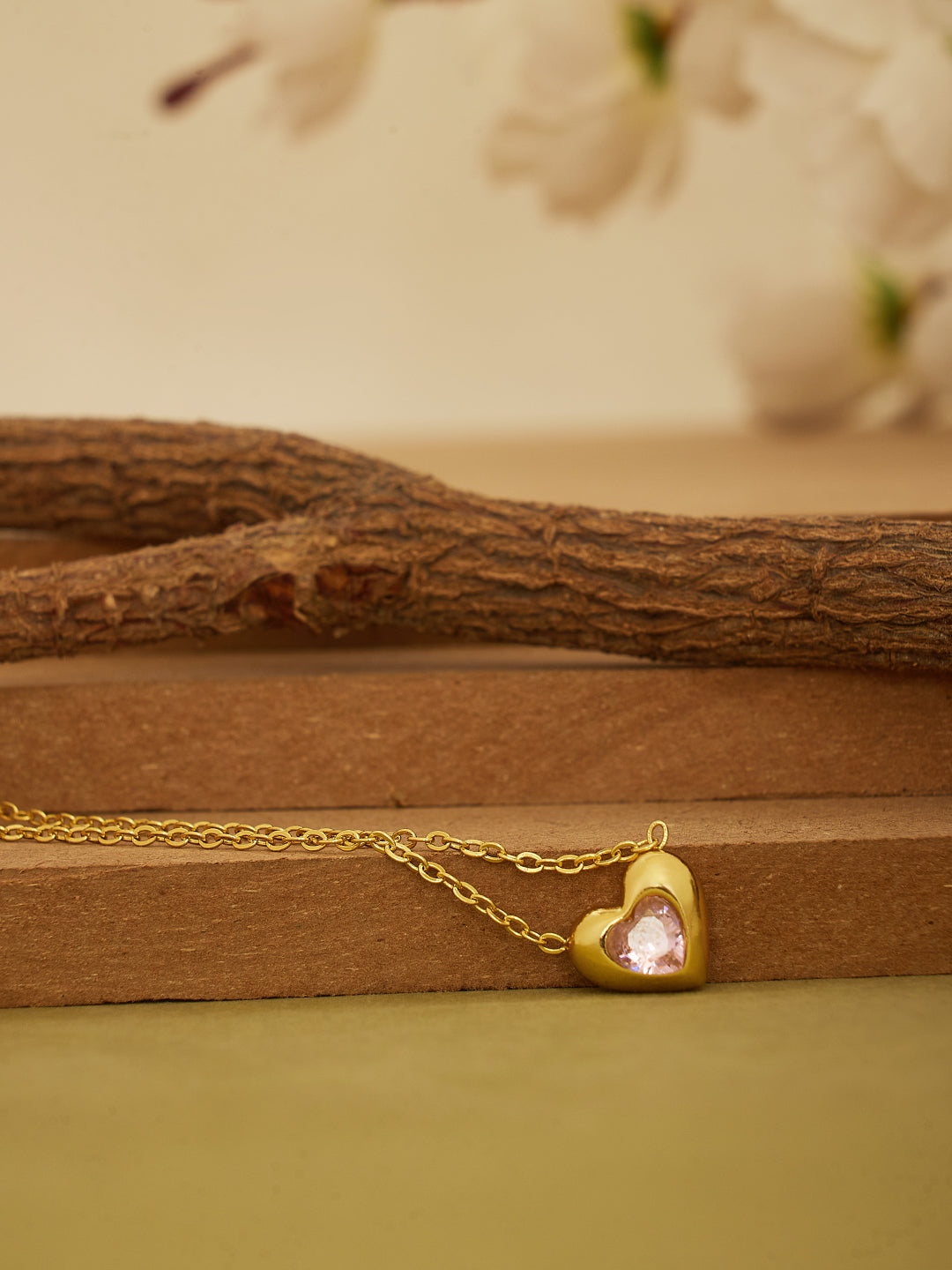 This elegant necklace features a dainty gold-toned chain with a heart-shaped pendant enclosing a sparkling pink stone. Lightweight and versatile, it beautifully complements casual wear, festive outfits, and romantic occasions.
