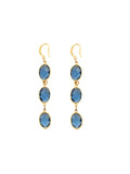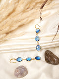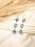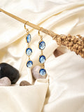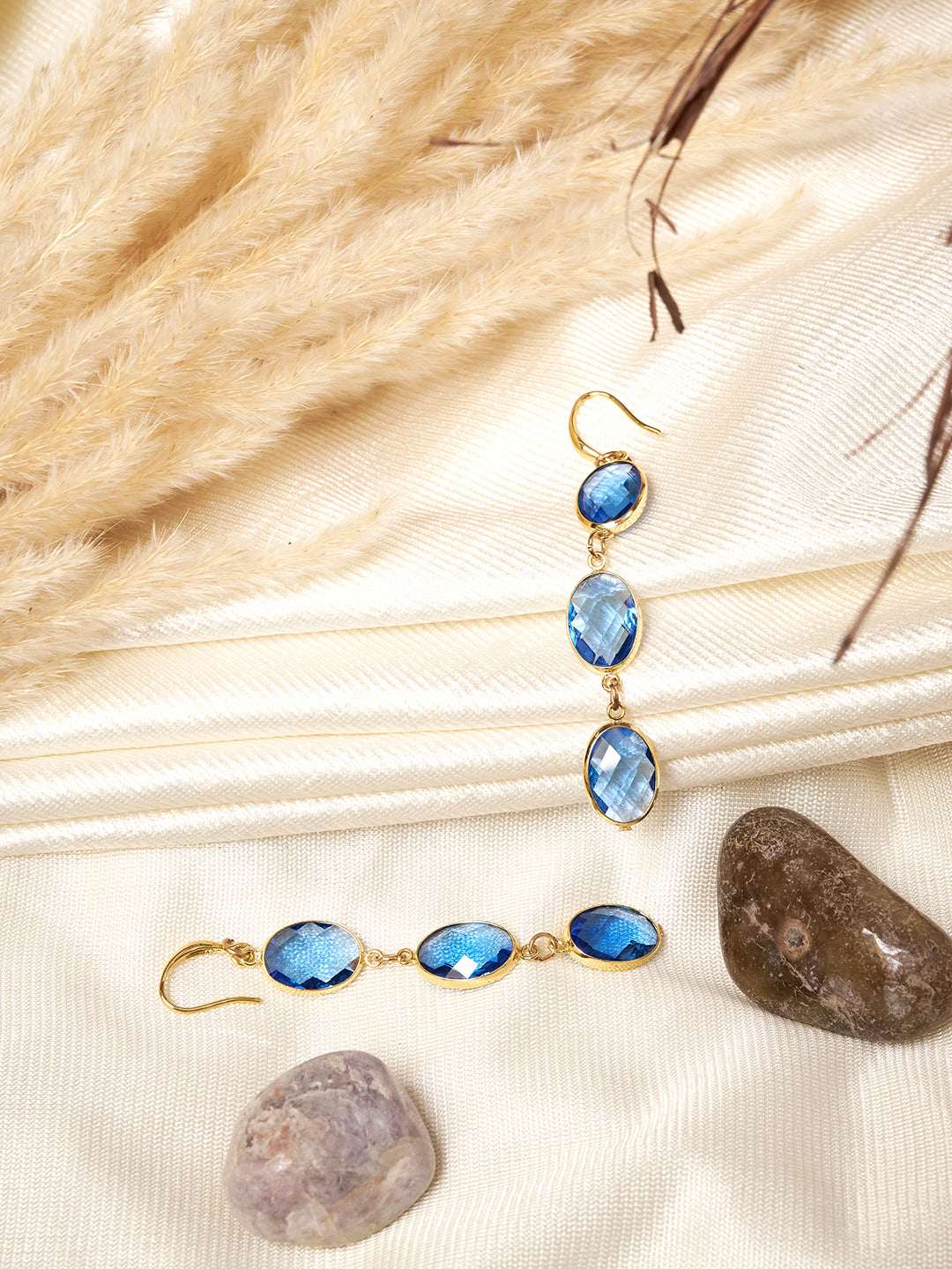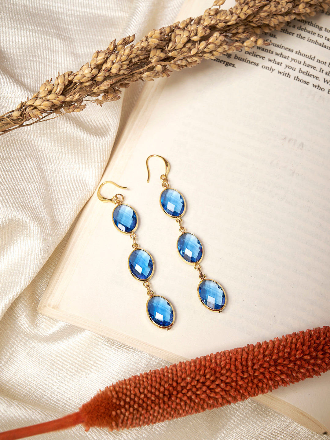 Product Details: Stylish long dangle earrings featuring three shimmering blue faceted stones in a gold-plated setting. Perfect for parties and elegant outings.