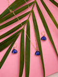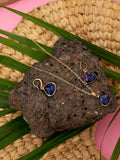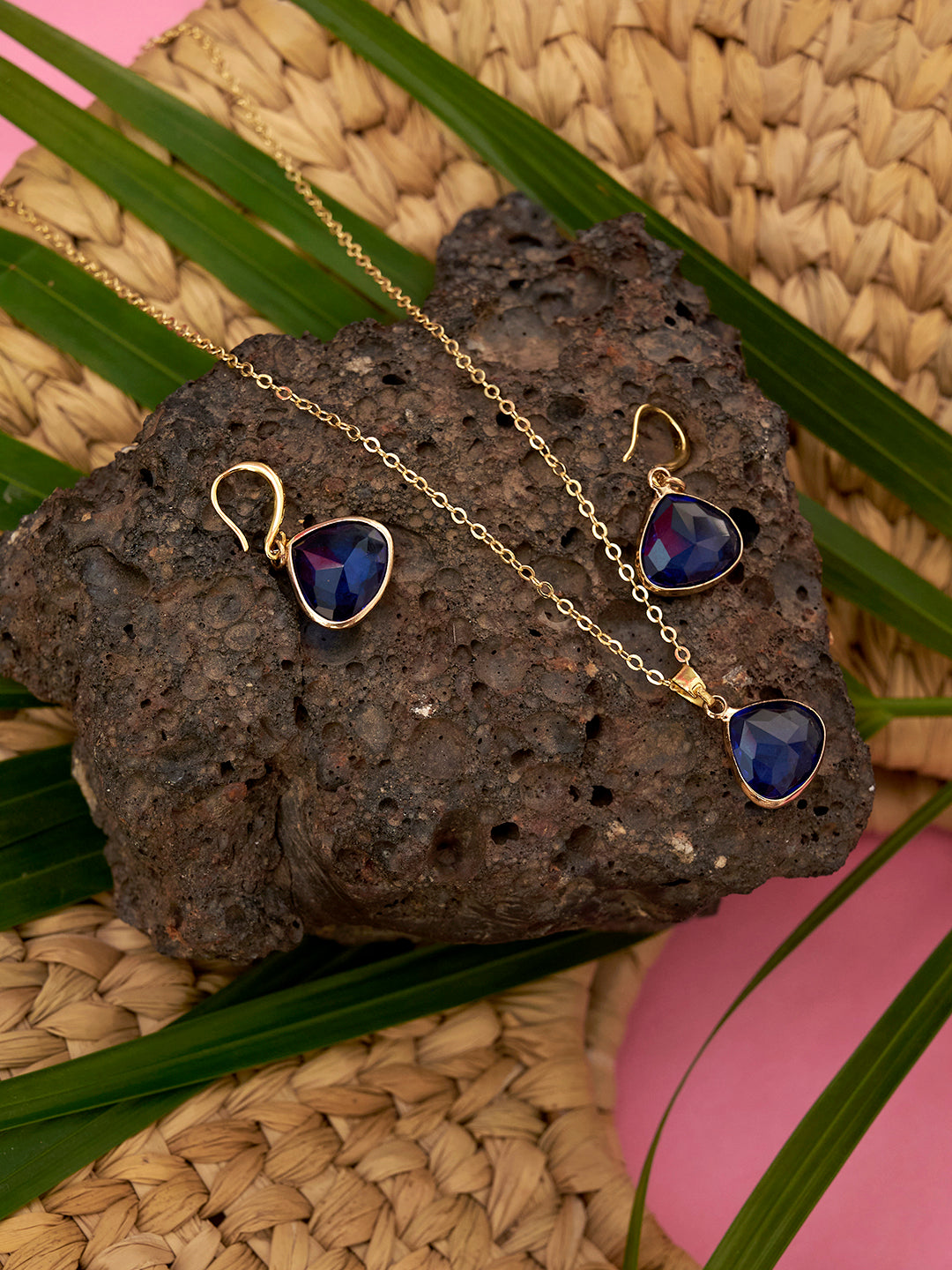Product Details: A beautiful jewelry set with a gold-plated chain necklace and matching drop earrings, each adorned with a striking deep blue faceted stone. Perfect for elevating both casual and festive looks.