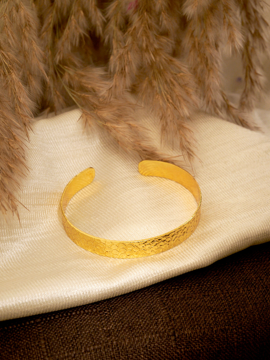 Product Details: A sleek open cuff bracelet with a hammered textured finish, crafted in gold plating. Lightweight, elegant, and versatile for styling.