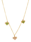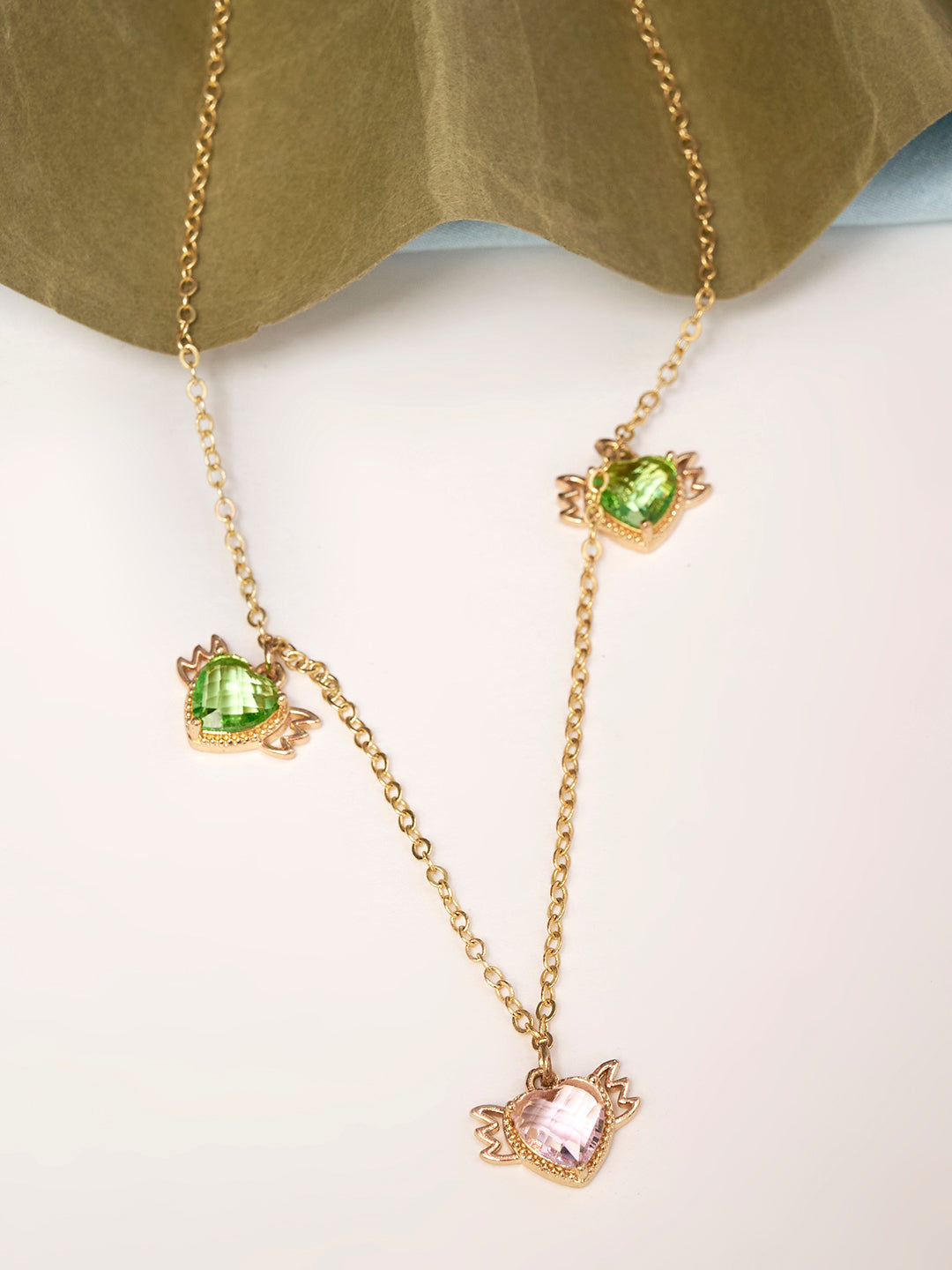 Add a playful yet elegant touch to your style with this gold-plated necklace featuring three-winged heart charms in green and pink. Perfect for layering or wearing solo.