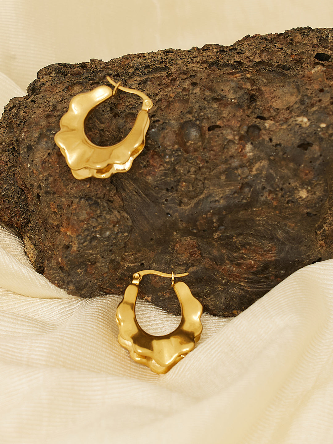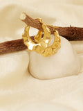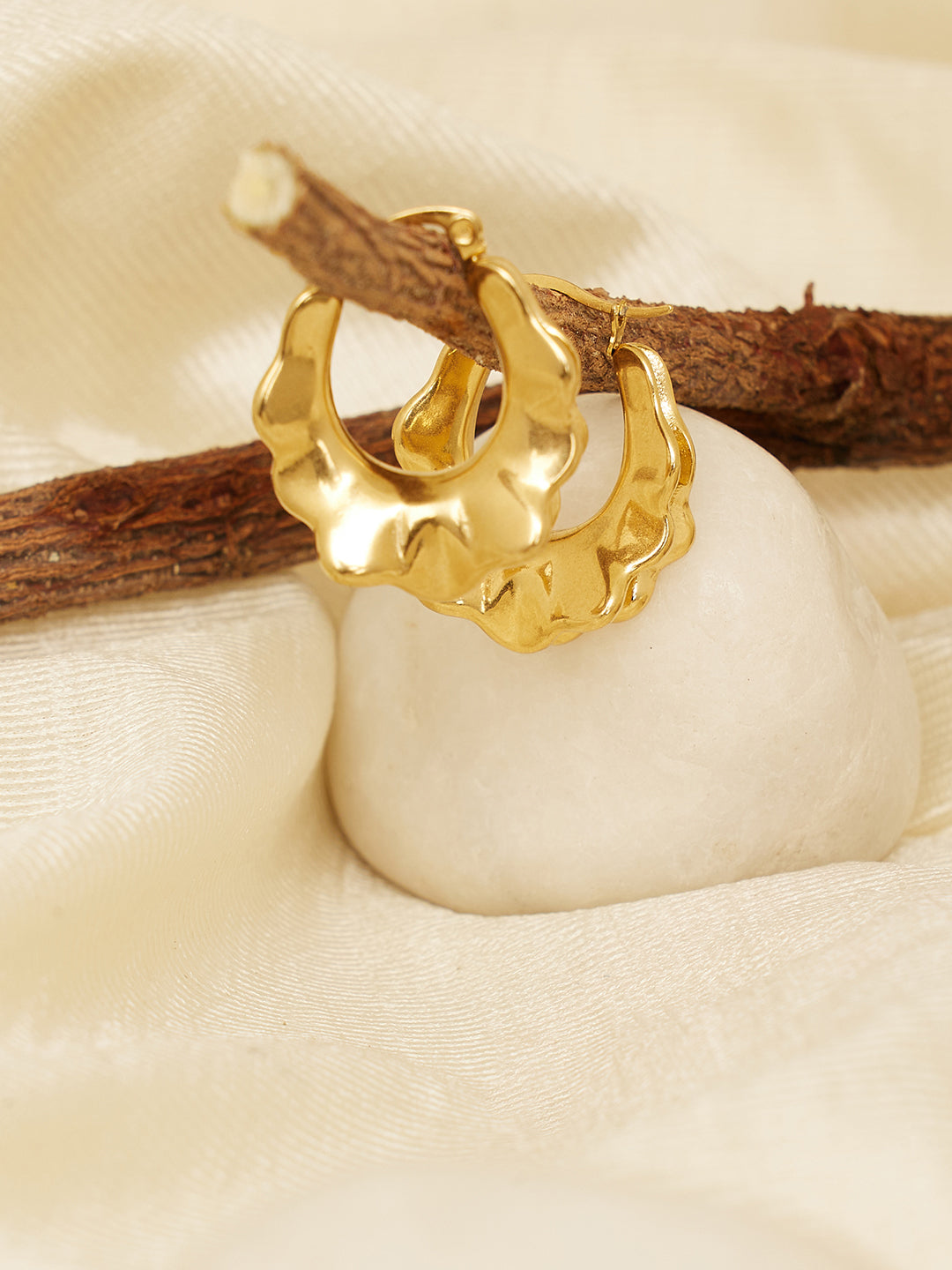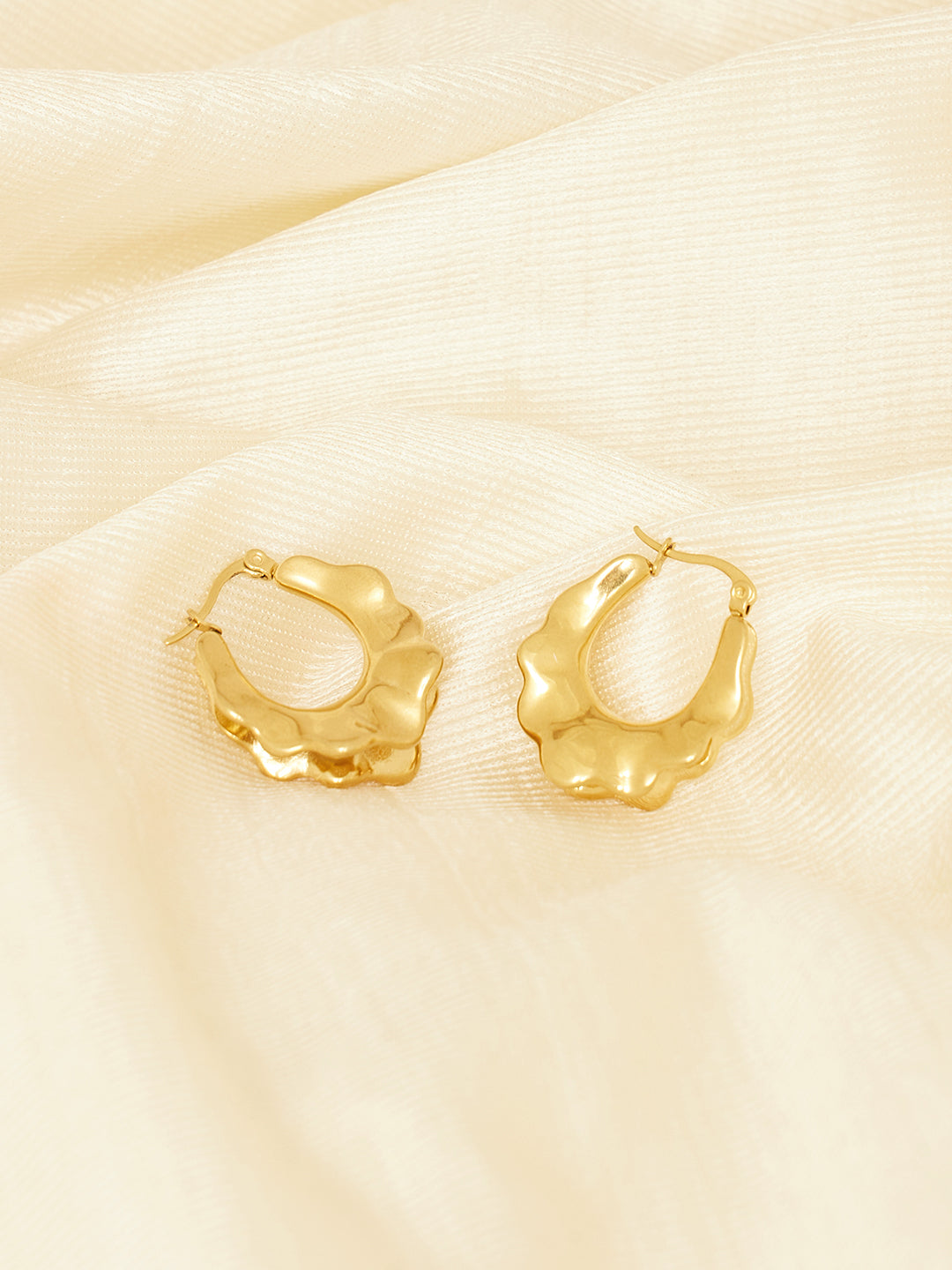 Product Details: Elegant hoop earrings designed in a scalloped floral-inspired silhouette. Their glossy gold finish makes them versatile and suitable for both traditional and modern looks.