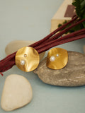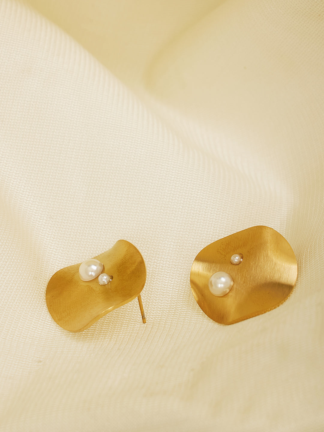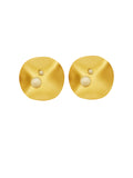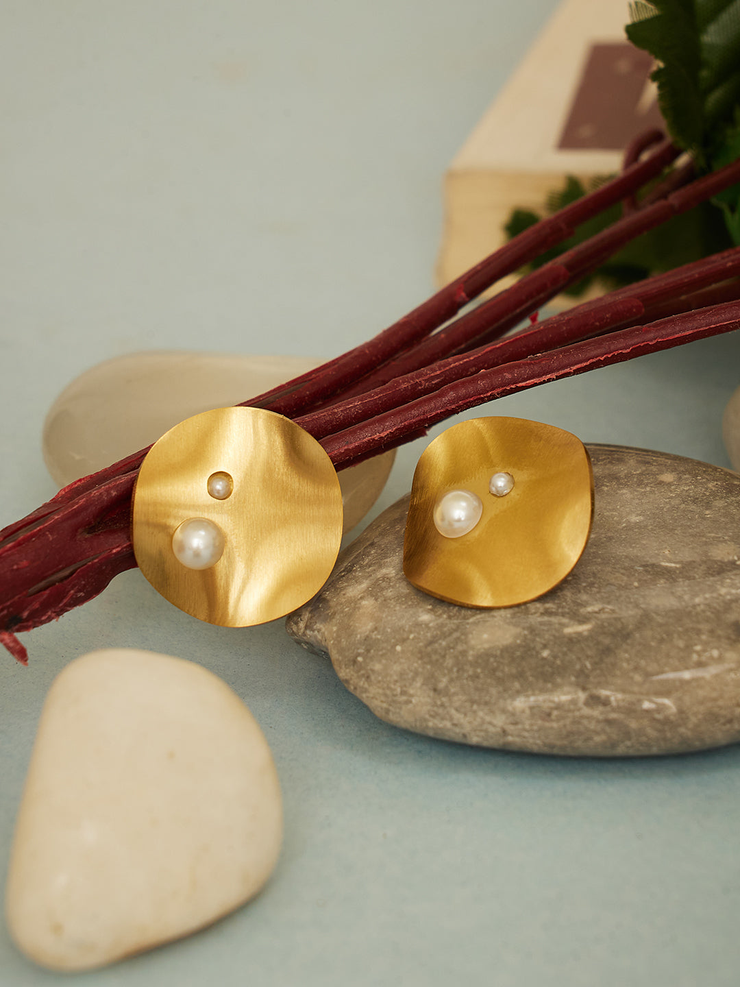 These earrings feature a bold, circular design with a satin-matte gold finish. The wavy surface adds a contemporary twist, while the two pearl embellishments bring elegance and sophistication. Ideal for elevating both everyday and festive looks.