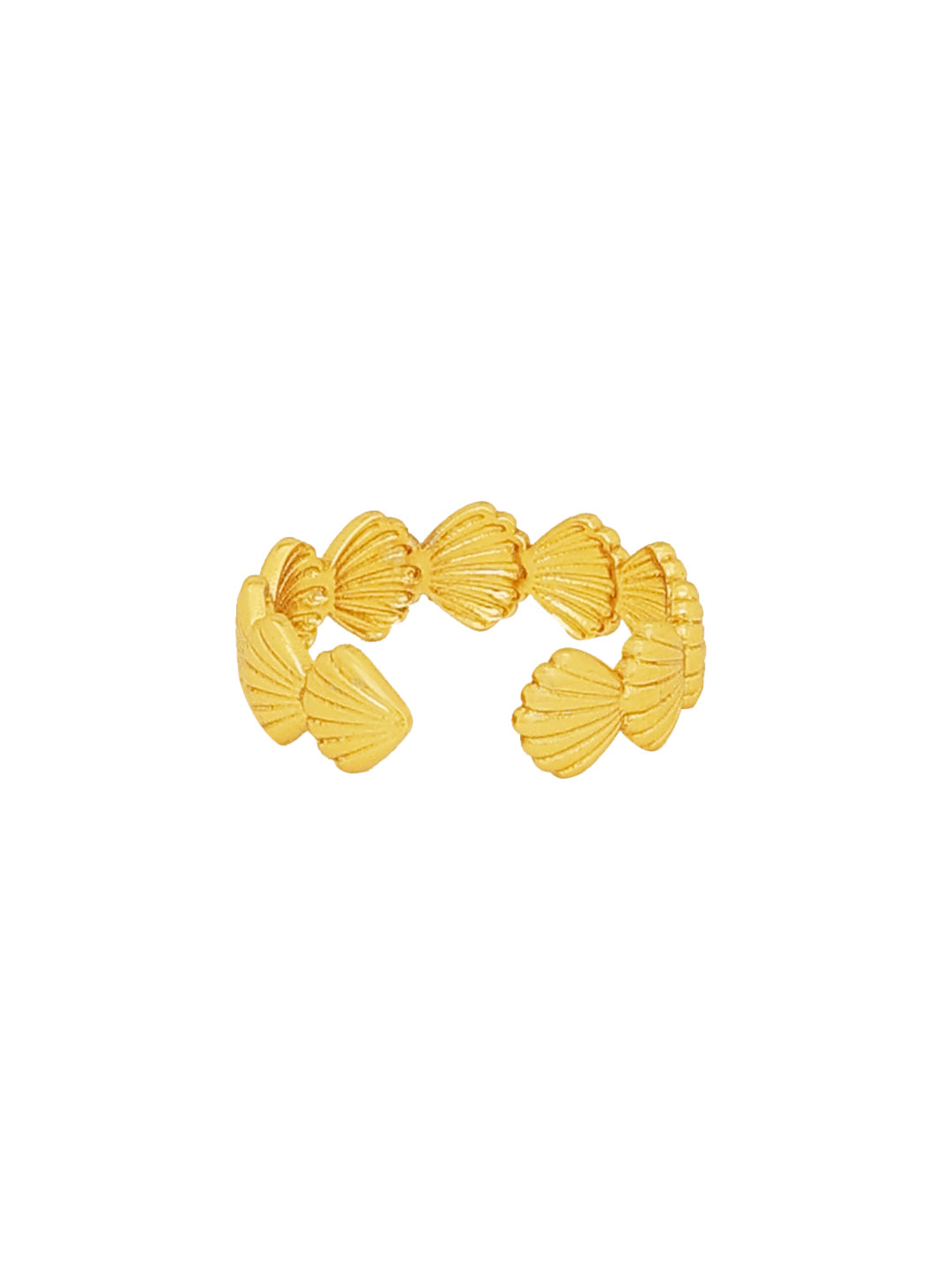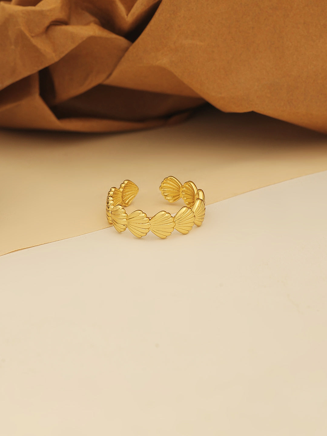 Inspired by coastal charm, this ring features a continuous design of textured seashells. Its minimal, nature-inspired aesthetic makes it an elegant choice for everyday wear or a vacation accessory.