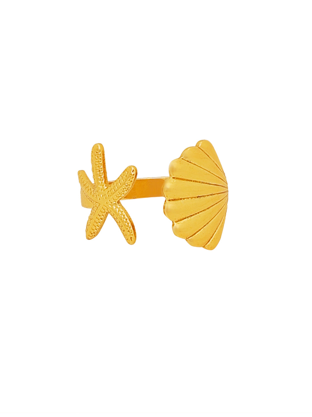 A charming seaside-inspired ring featuring a delicate starfish and shell motif on each end. This open ring celebrates coastal elegance and adds a playful yet refined touch to any look.