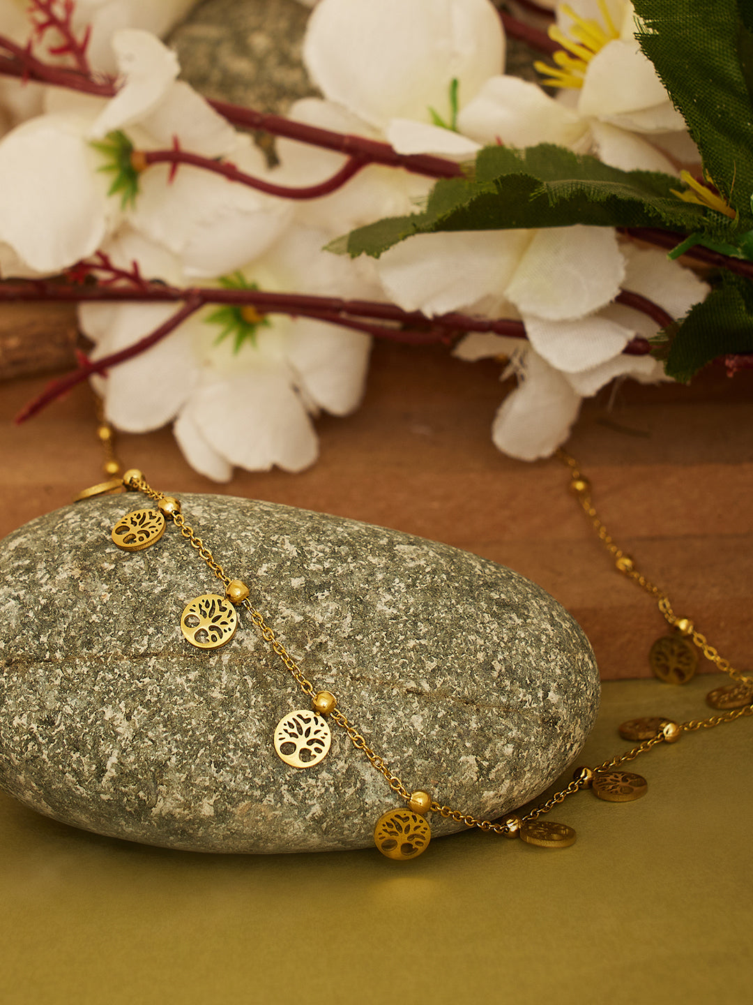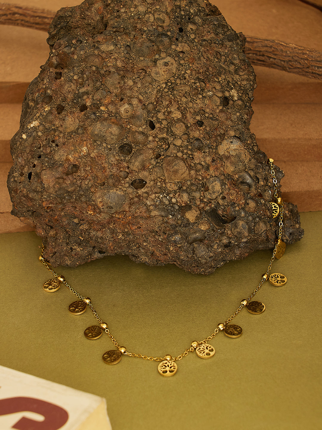 Elegant gold-toned necklace adorned with multiple dangling Tree of Life charms, symbolizing growth, strength, and positivity. Perfect for adding a touch of meaning and style to any outfit.