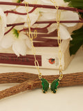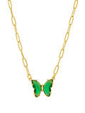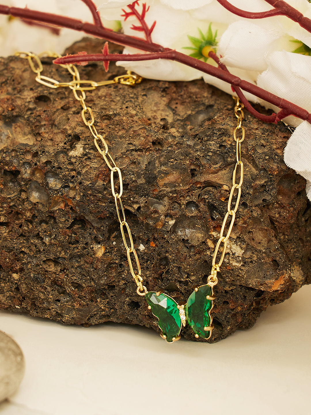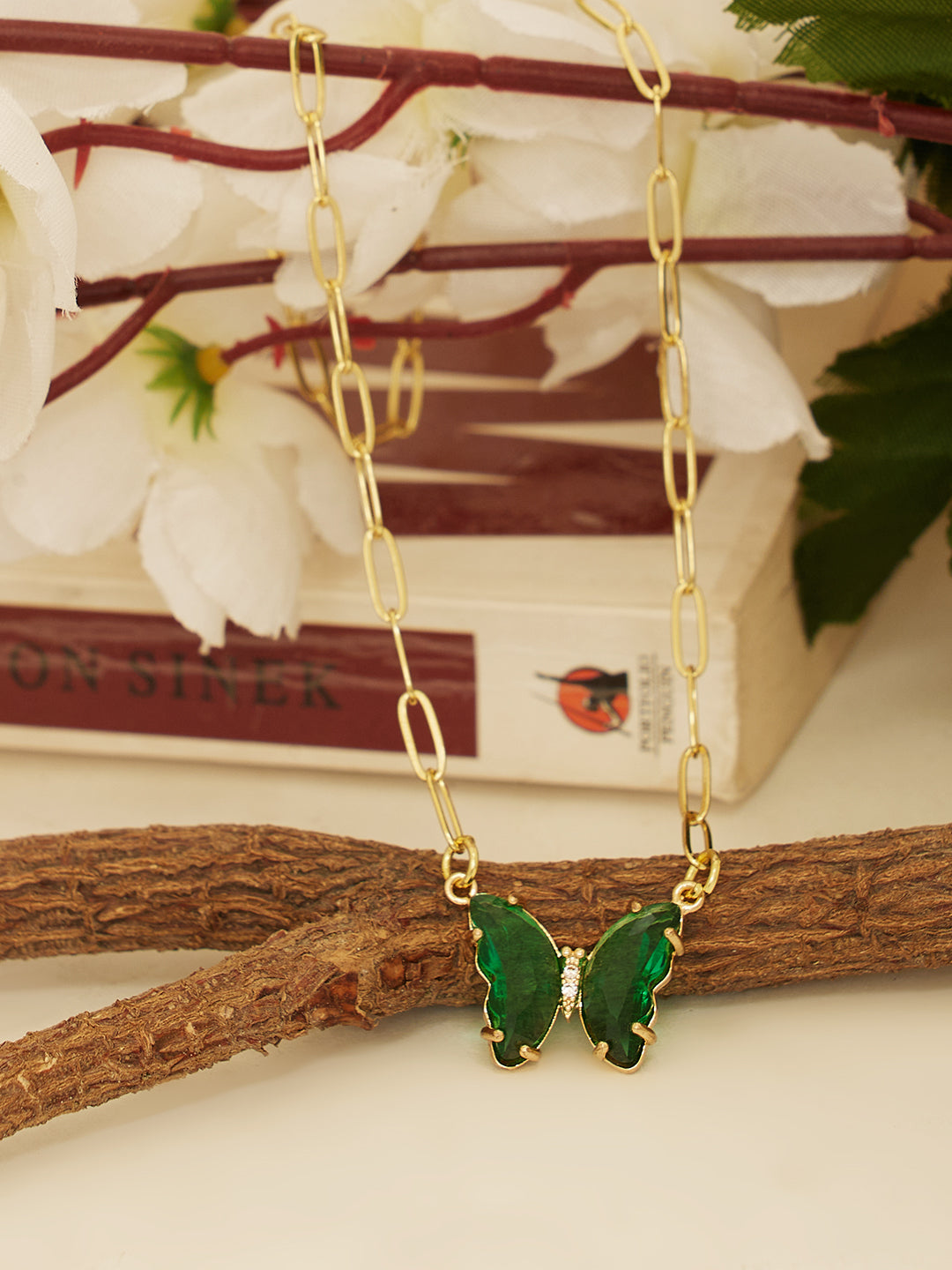 A dainty gold-toned chain necklace adorned with a striking green butterfly pendant, symbolizing elegance, transformation, and beauty.