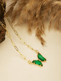 This necklace features a delicate gold-toned elongated link chain with a stunning green butterfly pendant. The enamel finish gives the wings a luminous effect, making it a graceful accessory for both everyday wear and special occasions.