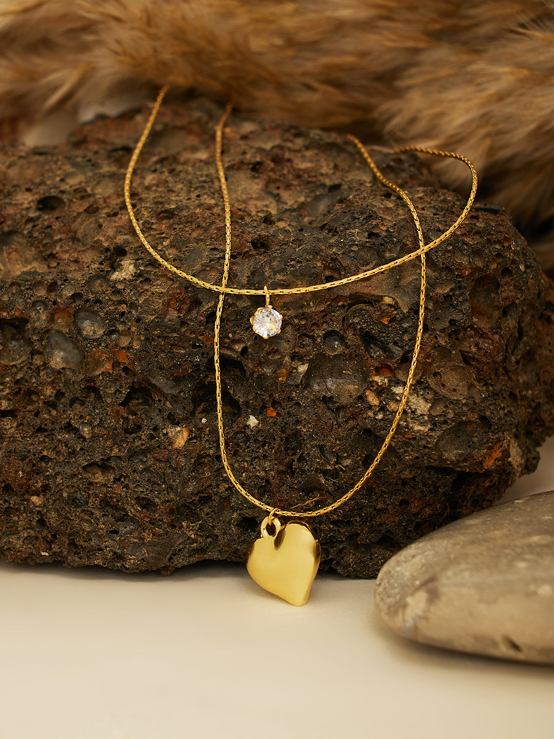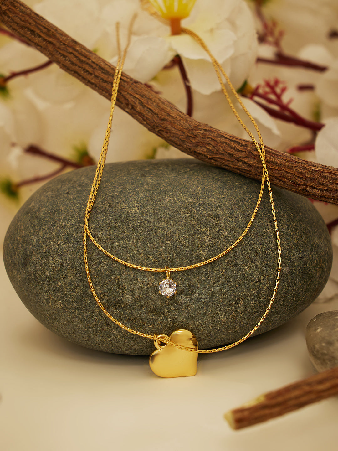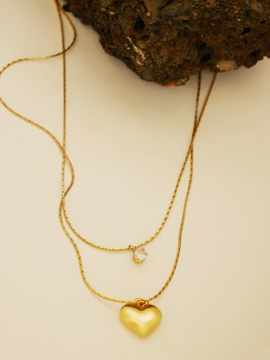This layered necklace comes with two fine gold-toned chains. The upper chain features a tiny cut-out charm, while the lower chain highlights a striking puffed heart pendant. Its layered style makes it perfect for adding depth and sophistication to both casual and festive outfits.
