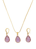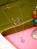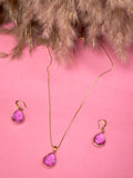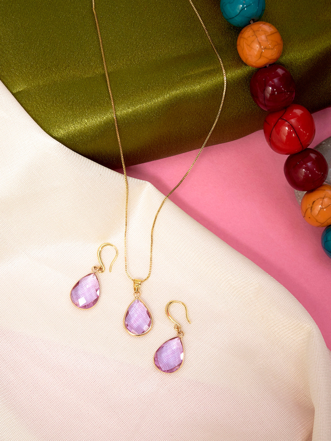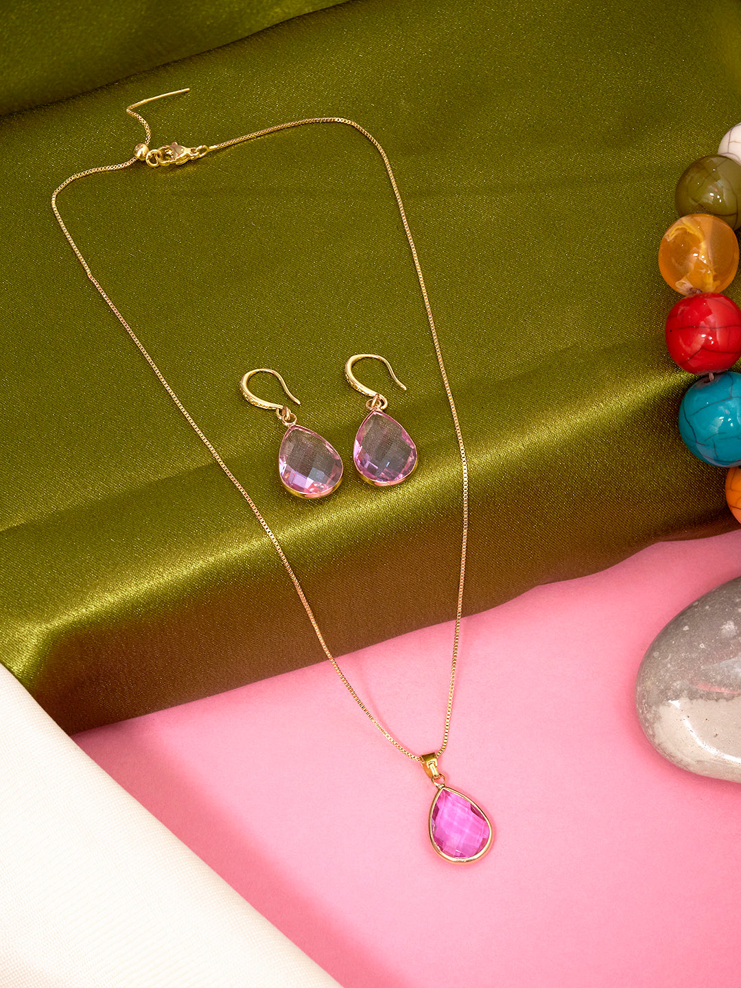 Product Details: Elegant gold-plated chain necklace paired with teardrop-shaped pink stone pendant and matching earrings. A delicate and charming set ideal for festive and casual occasions.