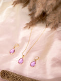 Gold-plated necklace and earring set featuring faceted pink teardrop stones. A feminine and versatile jewelry set, perfect for both casual and festive occasions.