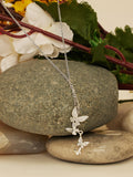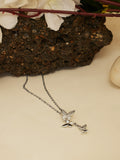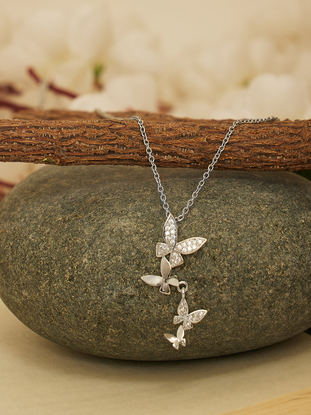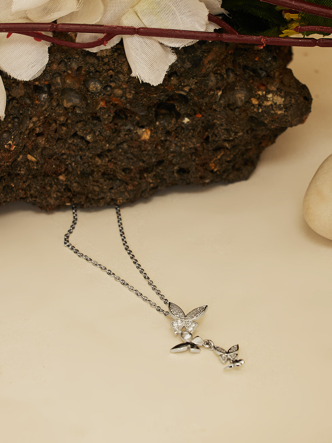 Elegant silver-toned butterfly necklace with sparkling stones, perfect for adding a delicate and charming touch to any outfit.