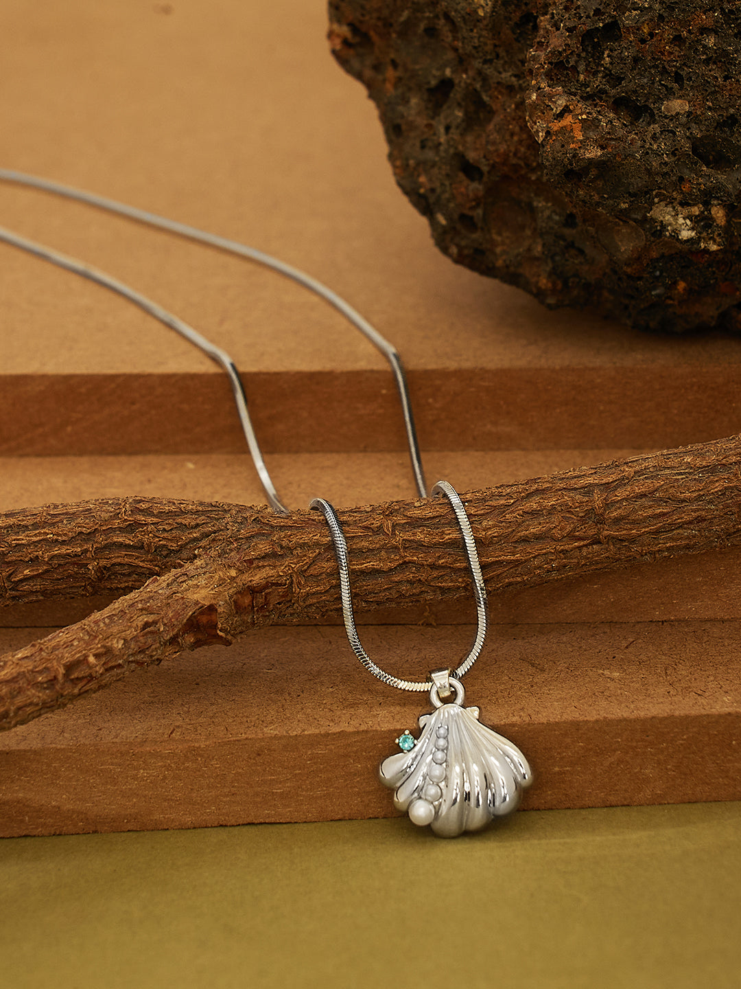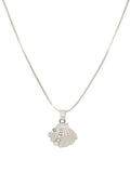 Elegant silver-toned seashell pendant necklace with pearl and green stone accents. Perfect for casual, party, or gifting. Add a chic ocean-inspired charm to your style.