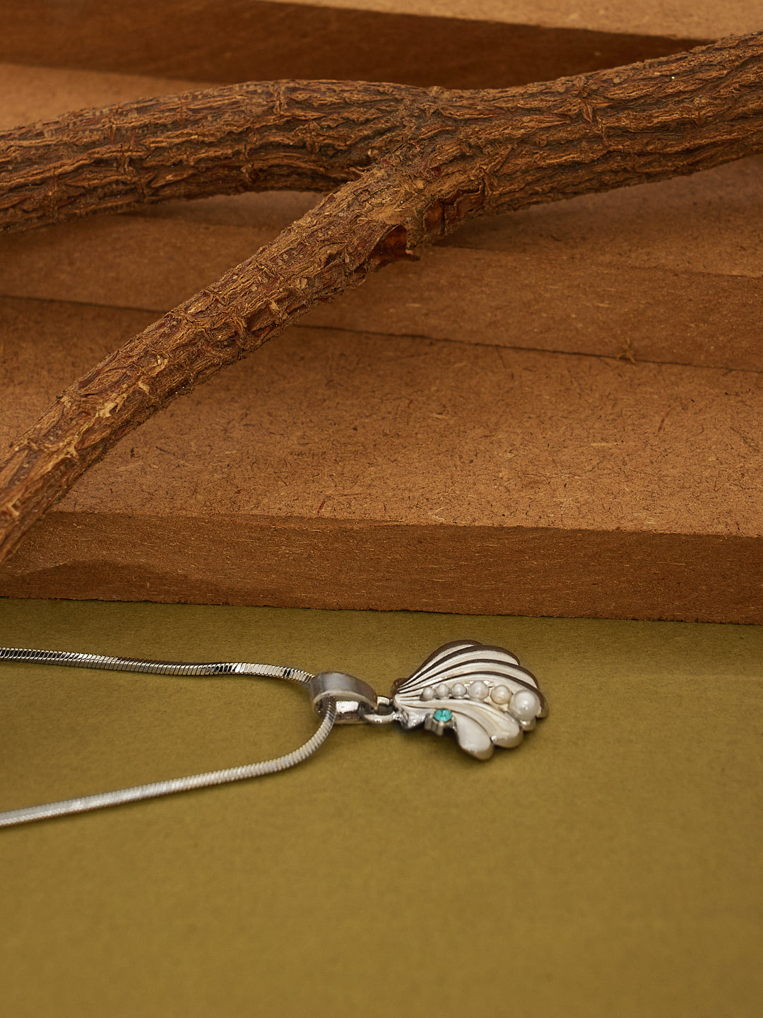 A delicate silver-toned chain necklace featuring a seashell-shaped pendant embellished with tiny pearls and a green stone. Chic and ocean-inspired, this piece adds an elegant touch to casual and festive looks.