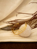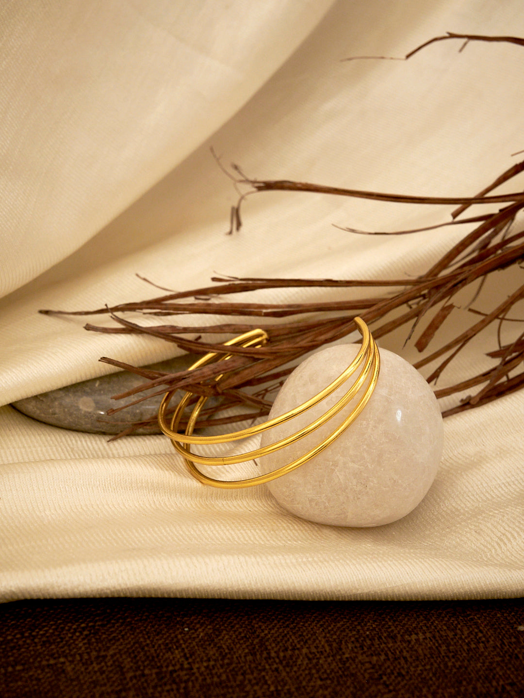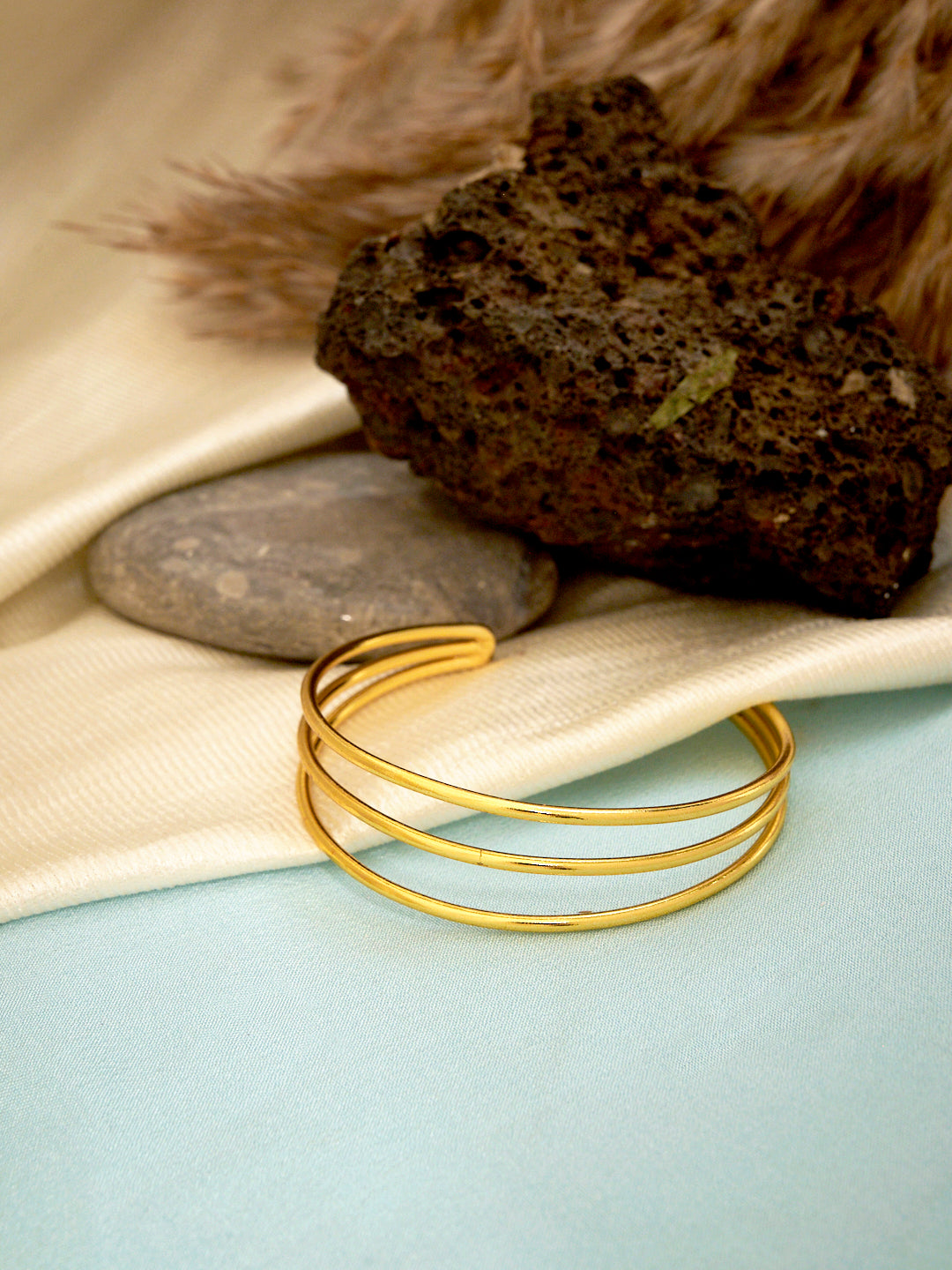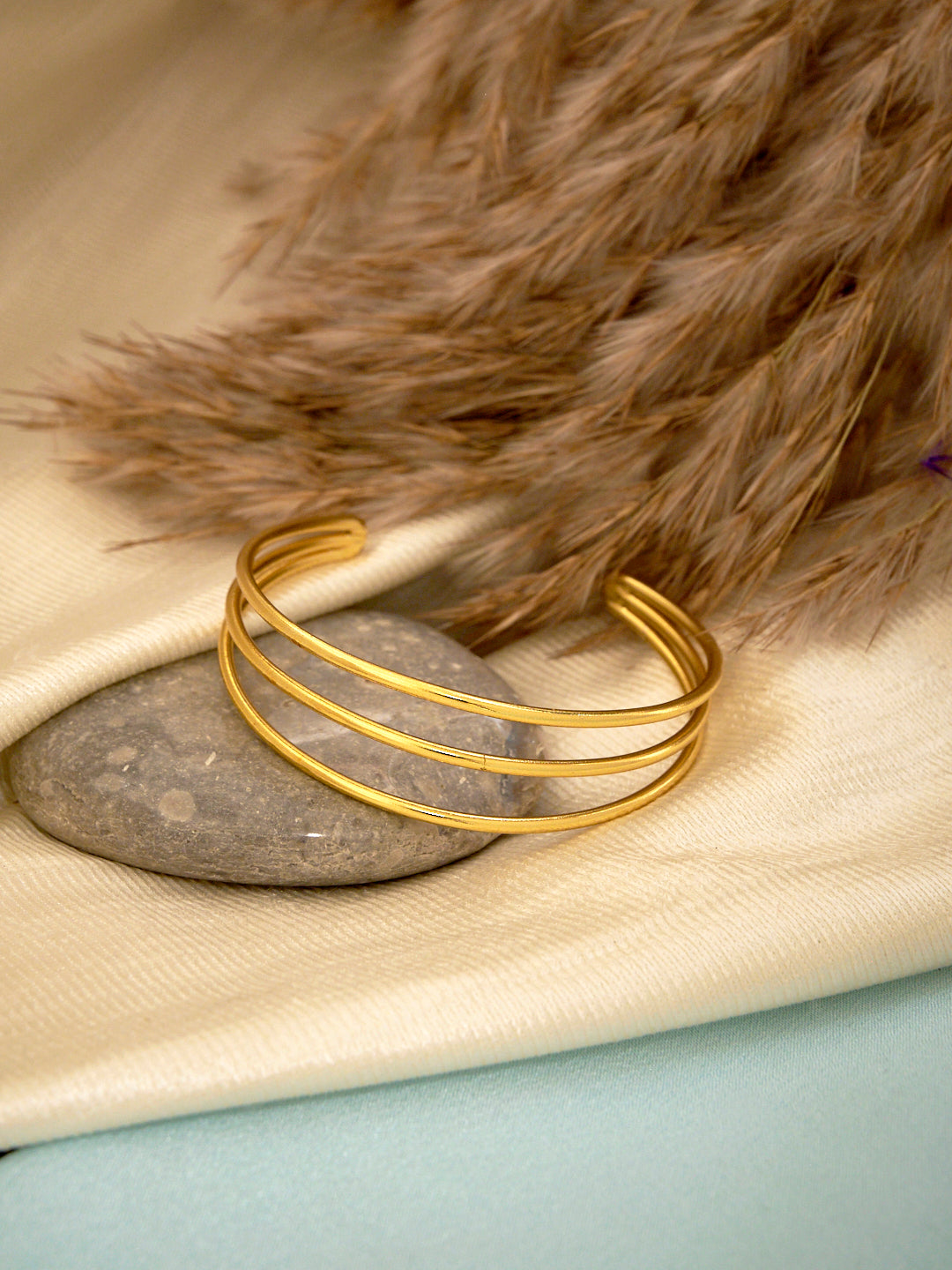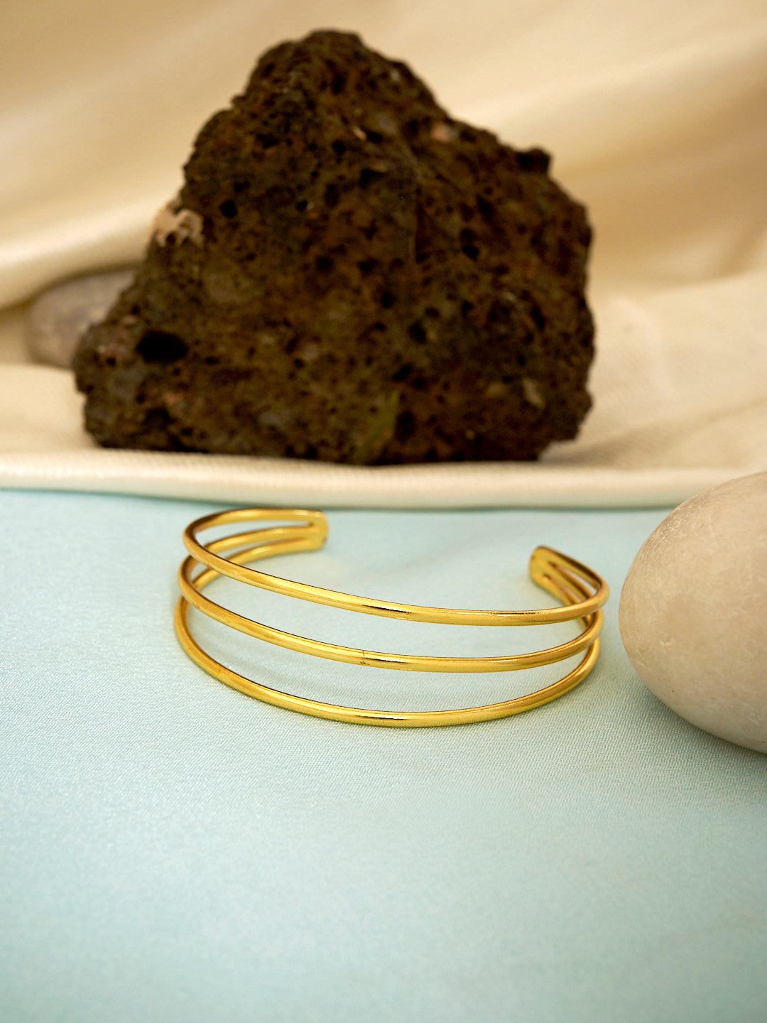 A sleek and minimalistic open cuff bracelet with triple gold bands. Its lightweight yet sturdy design makes it versatile for layering or wearing solo.